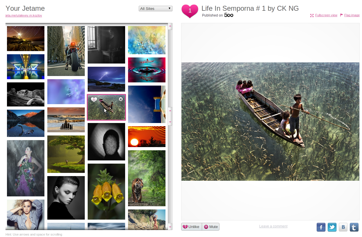 Система помечания избранных изображений на Jetame сделана довольно навязчиво: просмотренное крупным планом изображение автоматически считается понравившимся, если от него специально не отказаться. Впрочем, к этому быстро привыкаешь.