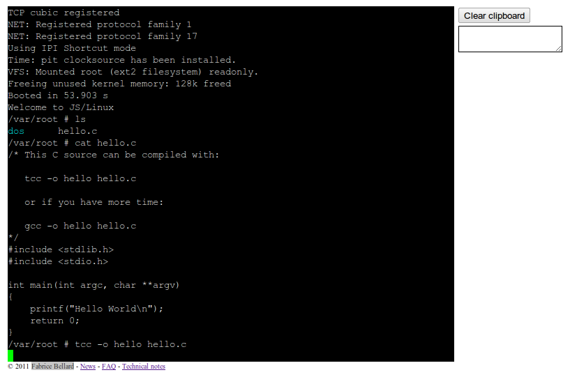 На JSLinux установлена пара компиляторов C и есть пример программы, печатающей "Hello World". Можно писать нормальные программы на C, компилировать их и запускать. Интересно, что когда я был студентом, и писал C-программы на настоящем компьютере с Unix, он работал медленнее, чем сейчас работает JSLinux, запущенный в Chrome на моём ноутбуке. Вот это - качественный прорыв!
