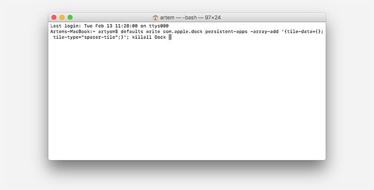 defaults write com.apple.dock persistent-apps -array-add »{tile-data={}; tile-type=«spacer-tile»;}»; killall Dock