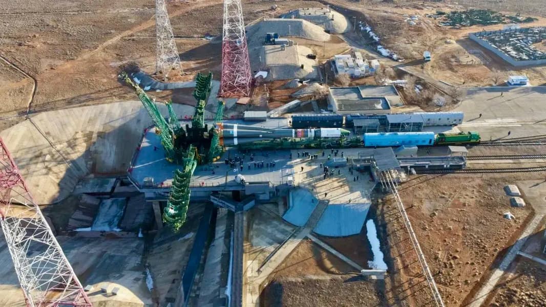 Роскосмос опубликовал редкие воздушные кадры, которые демонстрируют утренний вывоз ракеты на Байконуре, сделанные с дрона.
