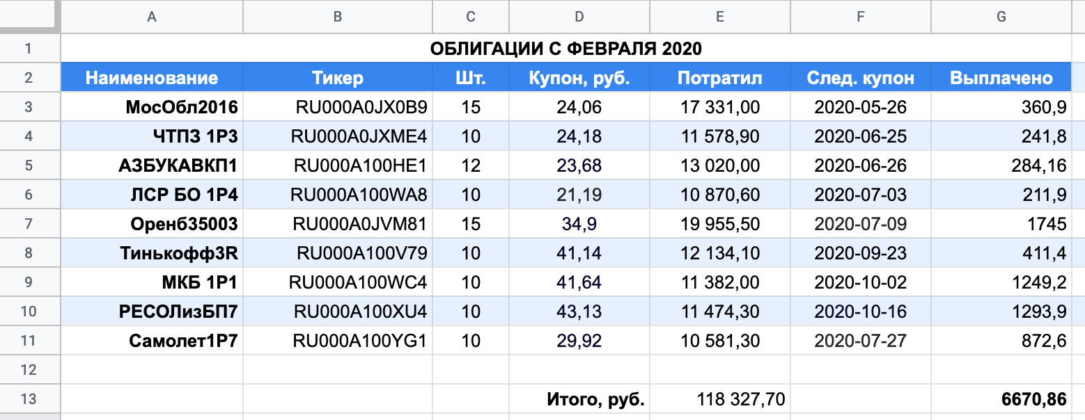 Я себя вижу консервативным инвестором, и мне кажутся привлекательней облигации. В трех банках, где у меня были вклады, я открыл брокерские счета и на часть денег купил как государственные ОФЗ, так и корпоративные бумаги. Не забыл и про ИИС (индивидуальный инвестиционный счет), с которого государство возвращает 13% каждый год. Подумал, что грех не воспользоваться таким предложением. Вот мои бумаги: