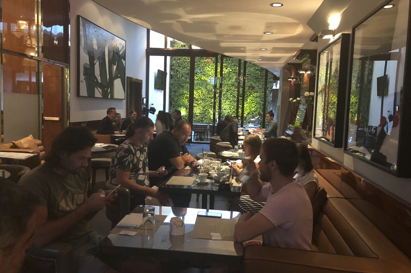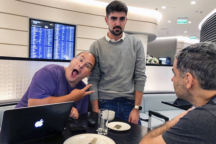 Наконец все формальности пройдены, до посадки в самолёт остаётся ровно час. Можно посидеть с кофе и пообщаться с коллегами по путешествию, которые тоже собираются вокруг.