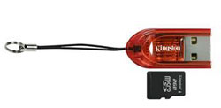 Компания Kingston начала продажи комплектов состоящих из карты памяти формата microSD и миниатюрного USB-кардридера. Если установить карту памяти в кардридер, то получится очень компактный USB-накопитель. На данный момент доступны комплекты с картами на 1 и 2Гб. Заявленная скорость работы находится на уровне 13Мб/c для чтения и 3,5Мб/c для записи. Показатели не рекордные, однако, для мобильных устройств более чем достаточные. Кардридер подключается к компьютеру по интерфейсу USB 2.0. Новинка доступна в корпусах двух цветов (чёрный и красный). Стоимость комплектов начинается с отметки в $19 (за 1Гб версию).