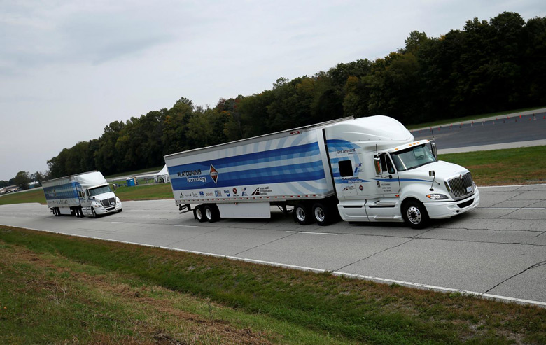 Головным грузовиком управляет водитель, манипулируя, как обычно, рулевым колесом, педалями газа и тормоза. Два других грузовика, которые следуют в колонне, повторяют действия головной машины. Отметим, что в кабинах этих грузовиков тоже находятся водители, готовые в любой момент взять управление на себя.