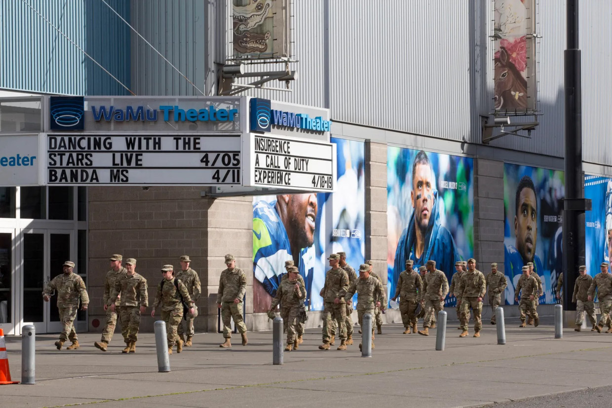Наше время относительно того чуть более мирное, и на этом фото солдаты высадились в Сиэтле, чтобы развернуть полевой госпиталь посреди стадиона Lumen