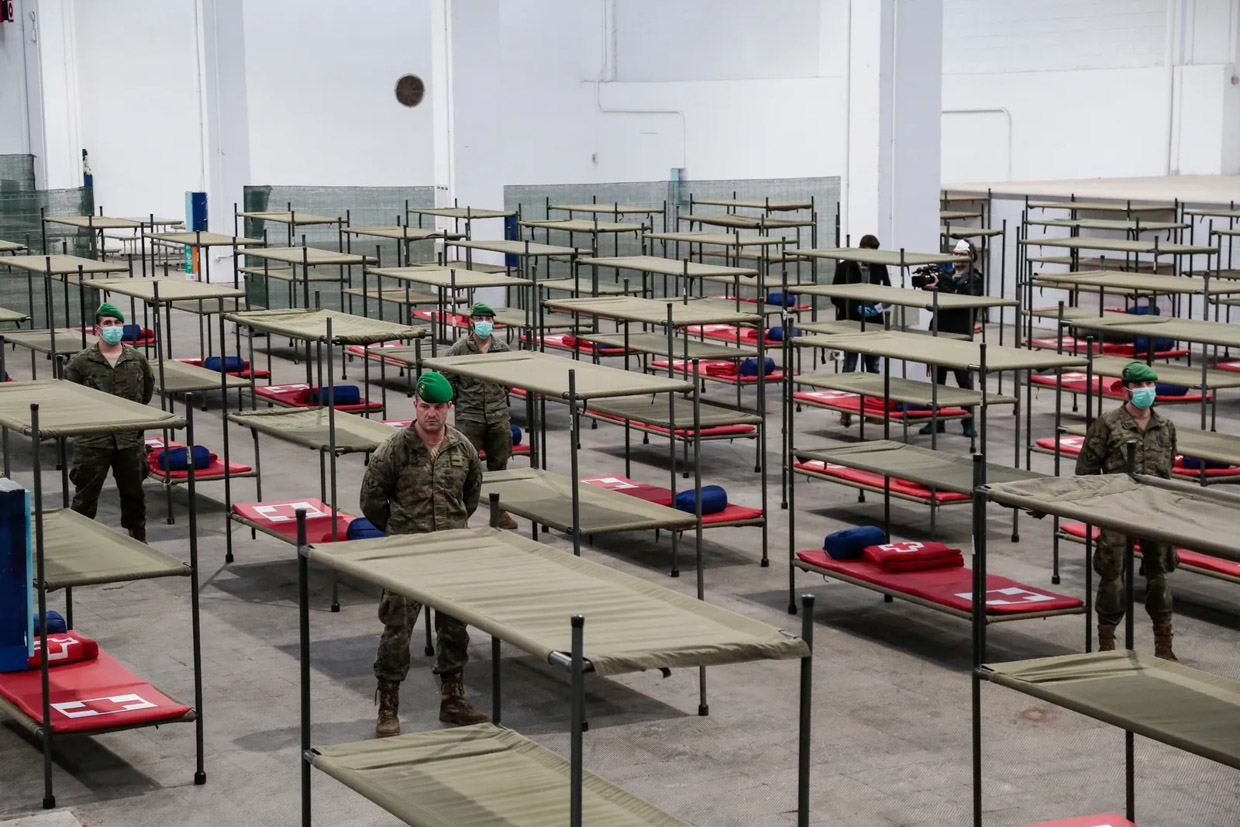 Испанские солдаты с Красным Крестом основали спальные места посреди конференц-центра. Это сделано для бездомных, которым нужна была помощь во время вспышки коронавируса