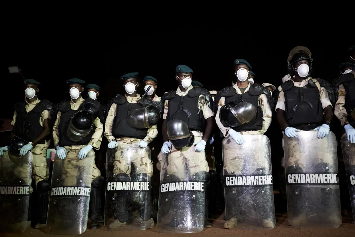 Полиция (или жандармы) Мали в масках и перчатках готовятся дезинфицировать центральный рынок Бамако