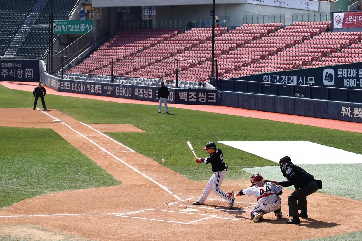 Теперь подход другой. Быстрое тестирование обеспечивает большую уверенность в людях рядом, но зрителей на многих соревнованиях больше нет. На фото команда LG Twins играет на стадионе Джамшил в Южной Корее