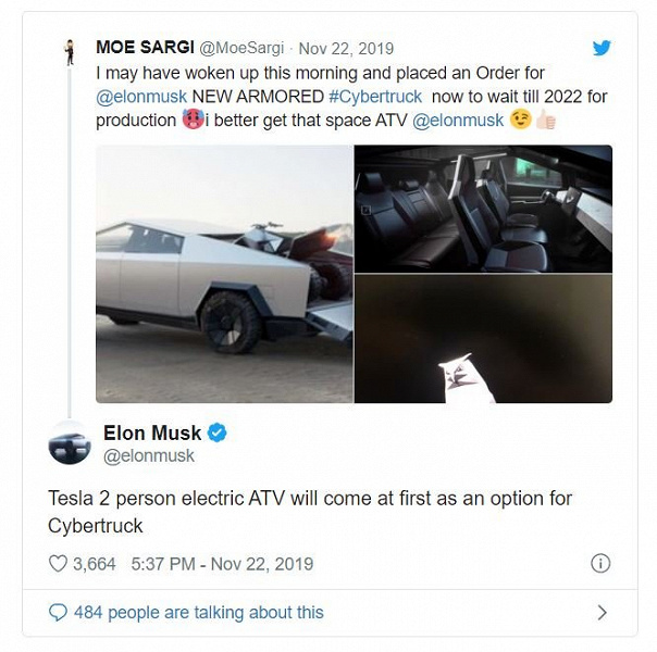 Так что купить квадроцикл отдельно (по крайней мере, на старте продаж Cybertruck и в течение какого-то времени после этого), не получится. Также Маск подтвердил, что Cyberquad рассчитан на двоих — водителя и пассажира.
