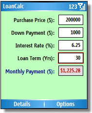 Разработчик программного обеспечения ScaryBear Software обновил программу LoanCalc для смартфонов на базе Windows Mobile. Она призвана помочь при расчётах выплат различных ссуд, например при покупке дома или автомобиля. Программа поможет вычислить суммы ежемесячных отчислений, в зависимости от суммы займа, первоначального взноса, годовой процентной ставки и срока займа. Приложение также выдаст общую сумму платежей и общую сумму процентов, в дополнение к годовой таблице отчислений. Эта программка полезна не только тем, кто "живёт" в кредит, но и, например, для агентов по продаже недвижимости и других служащих, часто сталкивающихся с необходимостью просчитать ссуду в мобильных условиях. В новой версии LoanCalc 1.3 заявлены такие измерения как модификация программы для ввода символа точки в десятичной дроби в поле "Проценты" с помощью нажатия любой кнопки, не являющейся цифрой, также программа была изменена, чтобы избежать автозаполнения текста, который мог появиться в полях ввода. Стоимость полной редакции программы составляет $6,95. Как обычно, в ближайшее время, демо-версию LoanCalc 1.3 можно будет найти в разделе "Программы для КПК" на HPC.ru.