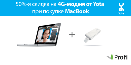 Магазин iProfi, премиум-партнер Apple, объявляет о проведении акции «4G-интернет от Yota для вашего Макбука». По этой акции каждый покупатель ноутбука Apple MacBook Pro нового поколения может купить с 50%-й скидкой 4G-модем от Yota, совместимый с платформой Apple. Перед покупкой любой пользователь сможет протестировать возможности 4G-интернета на подключенном демонстрационном оборудовании в торговом зале магазина. Сроки проведения акции — с 15 октября по 15 ноября. В акции участвуют все ноутбуки Apple MacBook Pro 13, 15 и 17". Более подробную информацию можно получить по телефону +7 (499) 272 43 24. Количество предложений ограничено! «iProfi — профессиональные решения от Apple»