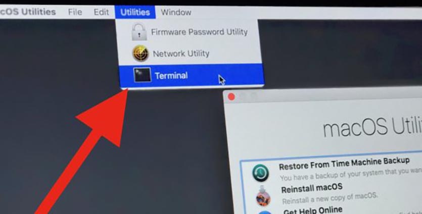2. После загрузки в режиме восстановления запускаем Терминал из строки меню (Утилиты — Терминал).