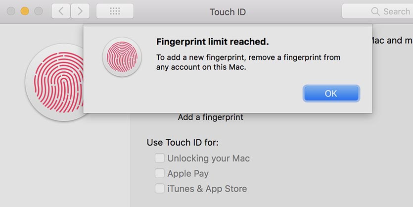 macOS сообщает о превышенном лимите сохраненных отпечатков для Touch ID и рекомендует удалить несколько для корректной работы.