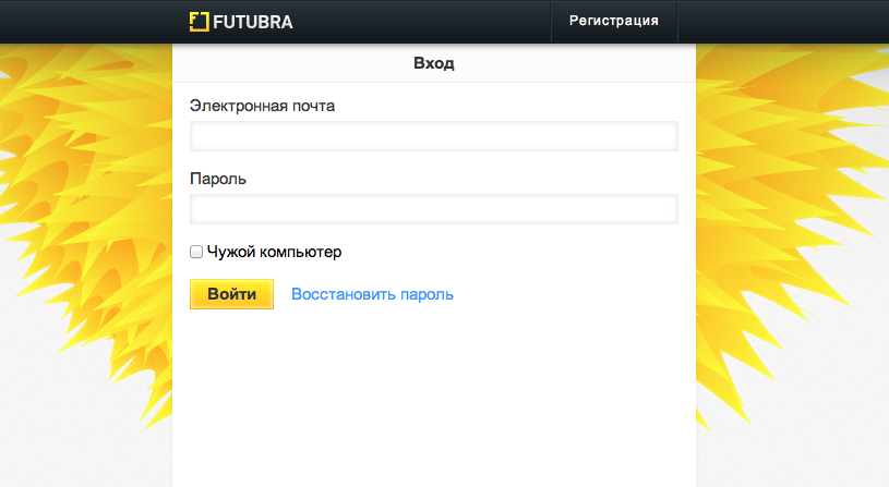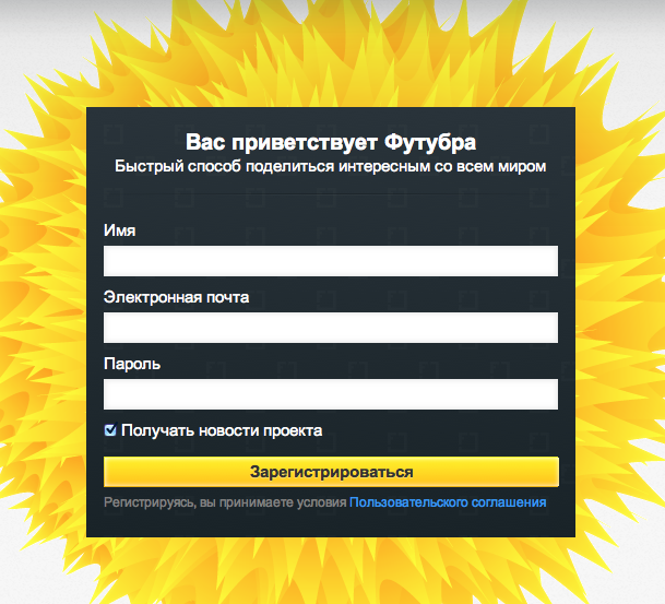 Движимый любопытством, я зарегистрировался. Чтобы это сделать, нужно обязательно вводить емейл и пароль — даже банальный OpenID использовать нельзя, не говоря уж о Facebook и ВКонтакте. Программисты настолько торопились, что даже авторизацию от mail.ru не настроили. Конечно, я указал при регистрации специально созданный для этого случая адрес на мейле же, чего и вам советую. Стараясь не смотреть на открывшуюся мне картину и убеждая себя в том, что «твиттер тоже без друзей странно выглядит», пошел в личный кабинет. Нормального адреса для него, увы, не оказалось — все пользователи имеют «порядковый номер на рукаве», вида http://futubra.com/13613. В общем, в этом нет ничего страшного, примерно также начинала сеть В Контакте, но сейчас на дворе 2012 год, и такое решение выглядит анахронизмом. К тому же, оно неплохо помогает массфолловерам, которые моментально начали накручивать свои аккаунты — чтобы записаться в читатели, не нужно изучать API, достаточно просто поочередно вызывать url с добавлением единички, и нажимать на кнопочку в одном-единственном месте экрана. Так что набрать себе внушительную аудиторию пассивных последователей можно и без посещения ресурсов вроде antichat.ru и установки сомнительных программ — скрипт напишет любой школьник.