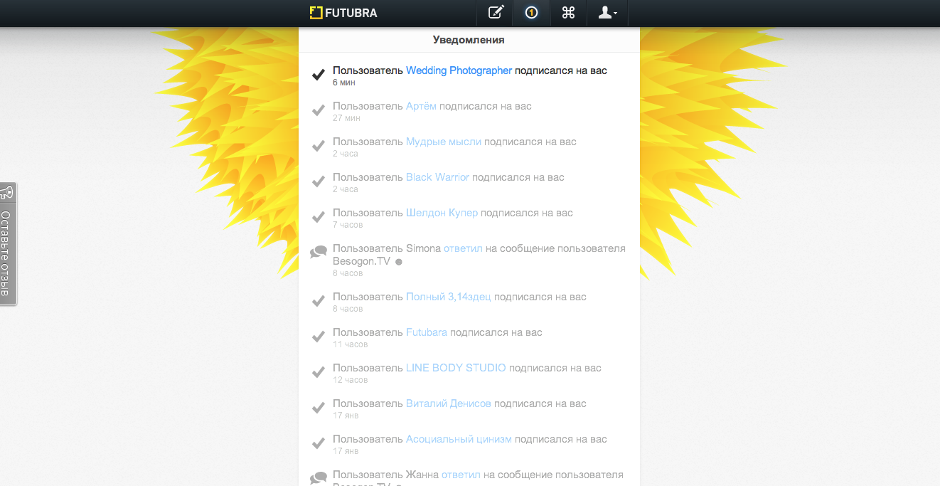 Окно оповещений на Футубре. Полюбуйтесь, какие прекрасные массфолловеры подписались на меня