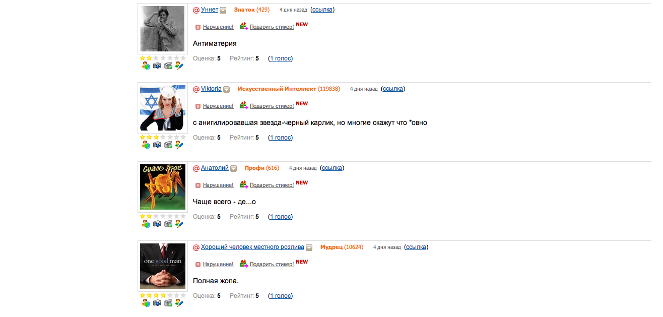Скриншот с одного из других проектов Мейл – Ответов. Обратите внимание на рейтинги отвечающих
