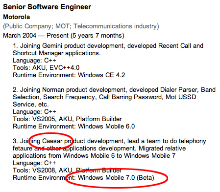 Motorola не делает тайны из того факта, что ее планы по созданию устройств на базе WinMo остаются в силе. Компания решила не ограничивать себя созданием мобильных устройств исключительно на базе операционной системы Google Android и параллельно ведет разработку смартфона на Windows Mobile 7. Очередным подтверждением этому стала появившаяся в Сети информация о вакансии главного инженера-разработчика ПО для оптимизации Windows Mobile 7 на мобильных устройствах. В тексте объявления упоминается аппарат под кодовым названием "Caesar". Ожидается, что именно он и станет первым смартфоном Motorola под управлением бета-версии WinMo 7. Если поступающая информация верна, то выход очередного смартфона Motorola с именем древнего правителя можно ожидать в середине 2010 года.