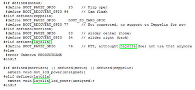Согласно появившимся в сети данным из исходного кода смартфона Motorola Cliq, компания Motorola занимается созданием нового смартфона на базе Android под названием La Jolla, что в переводе с испанского означает «драгоценность». Судя по всему, речь идет об экономичной модели смартфона, в первую очередь рассчитанной на пользователей, которые ценят стиль. Что касается спецификаций, то, согласно слухам, в их число будет входить 528-мегагерцовый процессор Qualcomm, клавиатура MAX7359 и акселерометр Kionix. Также телефон будет оснащен сенсорным дисплеем Halo i2c с разрешением 240x400 пикселов. Но самой примечательной особенностью телефона станет то, что он будет первой «раскладушкой» на базе операционной системы Android. Дата премьеры устройства, равно как и его возможная цена, пока неизвестна.