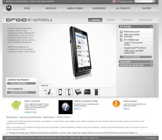 На официальном сайте Motorola слегка преждевременно появились полные спецификации и фотографии Droid, второго телефона компании на платформе Google Android. Новинка может похвастаться широкоформатным 3.7-дм сенсорным экраном с разрешением 480 x 854 и 5-Мп камерой с 4-x кратным зумом, автофокусом и двойной LED вспышкой. Заявленное время работы 1400 мАч Li-ion батареи составляет 385 минут в режиме разговора и 270 часов в режиме ожидания. Остальные технические характеристики новинки включают процессор с частотой 550 МГц, 16 Гб карту microSD, GPS, Bluetooth, 802.11b/g WiFi и порт micro USB. Габариты новинки 6.1 x 11.7 x 1.3 см, вес 171 г. Точные сроки появления в продаже и цена Motorola Droid пока неизвестны.