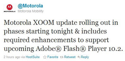 Компания Motorola сообщила приятную новость для тех, кому сильно не хватало поддержки стандарта Flash на планшете Xoom. Несмотря на слухи о том, что выход соответствующего программного обновления может быть перенесен на несколько недель, компания заявила, что оно будет доступно уже сегодня. В официальном твиттере Motorola Mobility появилось сообщение о том, что планшет Xoom на базе операционной системы Android 3.0 Honeycomb 11 марта получит поддержку Flash 10.2. Судя по всему, процесс обновления будет проходить поэтапно. Поэтому если вы до сих пор не получили уведомления о доступности обновления ПО, то это обязательно произойдет в течение одних-двух суток. После появления поддержки Flash единственным недостатком Motorola Xoom (разумеется, помимо высокой цены), останется отсутствие аппаратного обеспечения для работы в сетях 4G LTE.