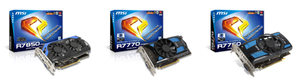 Компания MSI официально представила весьма солидное пополнение в своей линейке графических карт на базе решений AMD Radeon HD 7000 в виде трех моделей серии R7000 Power Edition. Новинки под названием R7850 Power Edition 2GD5/OC, R7770 Power Edition 1GD5/OC и R7750 Power Edition 1GD5/OC являют собой нестандартные версии адаптеров Radeon HD 7850, Radeon HD 7770 и Radeon HD 7750 соответственно, а к их особенностям можно отнести фабричный разгон и компоненты повышенной надежности Military Class III. Последние представлены конденсаторами Hi-c CAP с танталовым сердечником, дросселями с ферритовым сердечником и твердотельными конденсаторами.