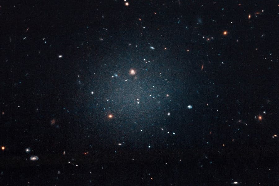 Галактика NGC 1052-DF2. Источник: NASA, ESA, P. van Dokkum (Yale)Галактики DF2, DF4 и DF9 обладают рядом уникальных характеристик. Они ультрадиффузные, то есть имеют крайне низкую плотность звёзд, что делает их почти прозрачными. Кроме того, они содержат сверхъяркие звёздные скопления, а их расположение выстраивается в линейную структуру, что указывает на общее происхождение. Учёные предполагают, что эти галактики образовались в результате столкновения двух карликовых галактик на огромной скорости — процесса, названного «Bullet Dwarf».
