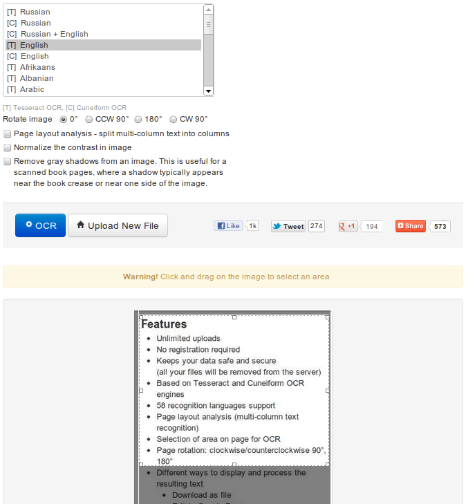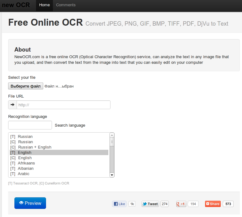 Всё предельно понятно, выбираем файл из сети или с компьютера (поддерживаются форматы JPEG, PNG, GIF, BMP, TIFF, PDF и DjVu), выбираем язык и способ распознавания (в Cuneiform можно распознать смешанный, русско-английский текст; в Tesseract пока почему-то нельзя) и практически всё.
