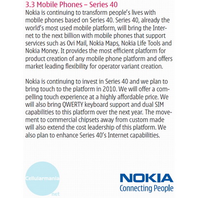 Согласно информации из финских источников, компания Nokia планирует представить в этом году несколько новых мобильных устройств на платформе S40. Новые смартфоны будут оснащены сенсорными экранами и клавиатурами QWERTY, а также смогут работать с двумя SIM-картами. По данным источника, Nokia в настоящий момент собирается подарить своим покупателям «неповторимые ощущения от пользования сенсорным интерфейсом при доступной цене». Компания также обещает усовершенствовать Интернет-возможности S40, хотя подробной информации об этом моменте пока нет.
