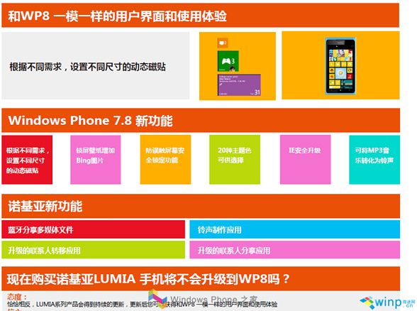 Лишним свидетельством ведущейся Microsoft и ее партнерами тщательной подготовки к предстоящему релизу Windows Phone 7.8 стали утекшие в сеть внутренние обучающие материалы Nokia, раскрывающие некоторые дополнительные подробности о будущей ОС. В частности, подтвержден обещанный ранее стартовый экран как в Windows Phone 8 с “живыми плитками” разных размеров. Кроме того, экран блокировки можно будет изменять и настраивать по вкусу, а в браузере Internet Explorer улучшена безопасность.
