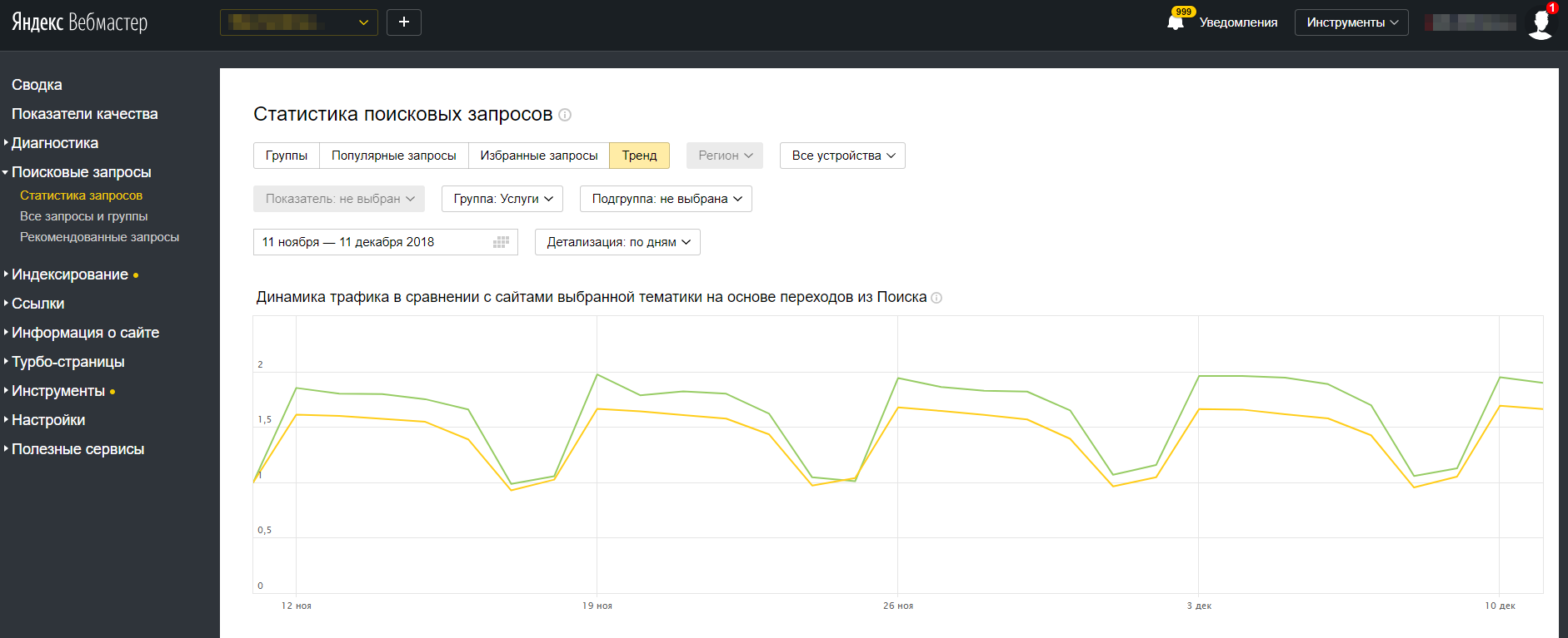 Инструмент «Тренды» не использует данные самого Яндекс.Радара, через него по-прежнему отображаются именно переходы из Поиска Яндекса. Данным обновлением мы продолжаем развивать инструменты для аналитики ситуации со спросом и конкурентами в нашем Вебмастере. Напомним, что совсем недавно мы дали возможность сравнивать показатели вашего сайта и выбранных вами сайтов конкурентов по таким категориям качества, как ИКС и знаки на Поиске в разделе «Показатели качества».