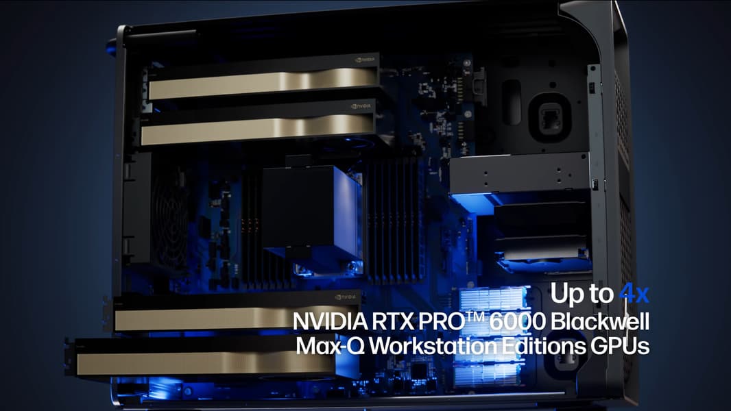 Изображение: HPГлавная особенность новинки — экстремальный объём локальной графической памяти. Каждая из RTX PRO 6000 Blackwell Max-Q имеет 96 ГБ GDDR7, то есть в максимальной конфигурации рабочая станция предлагает 384 ГБ видеопамяти.
