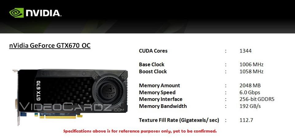Что касается прочих характеристик NVIDIA GeForce GTX 670, чей анонс ожидается уже совсем скоро, то тут пока можно лишь строить предположения, согласно которым в основе этого адаптера окажется тот же 28-нм чип GK104, что и у GeForce GTX 680, правда, его функциональность будет несколько урезана. Таким образом, в состав нового “кеплера” могут войти 1344 ядра CUDA и 2 ГБ “набортной” памяти GDDR5 с 256-битным интерфейсом. При этом базовая частота GPU предполагается в районе 950 МГц, а что касается “цены вопроса”, она ожидается на уровне $399-$429.