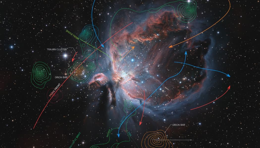 Иллюстрация: Nano BananaВ центральной части туманности спектральный индекс соответствует только тепловому излучению, однако на периферии впервые обнаружены локальные области с отрицательным спектральным индексом (до –0,7), что однозначно свидетельствует о наличии нетеплового (синхротронного) излучения. Авторы сопоставили эти области с данными в других диапазонах и выявили пространственное совпадение с фронтами ударных волн, связанными с выбросами молодых звёзд, а также с зонами возможного столкновения молекулярных облаков и областями, где сильные звёздные ветры формируют ударные оболочки.