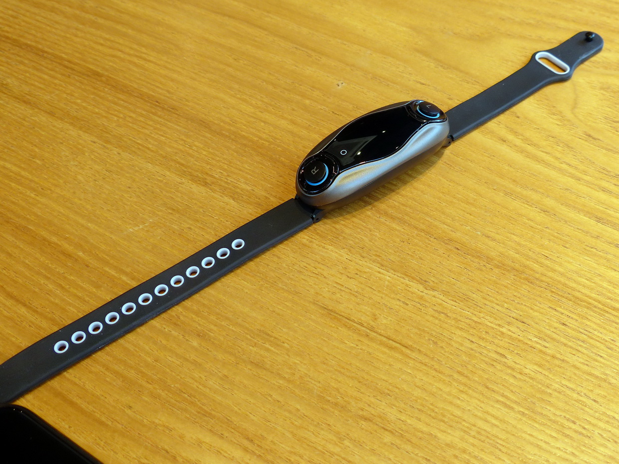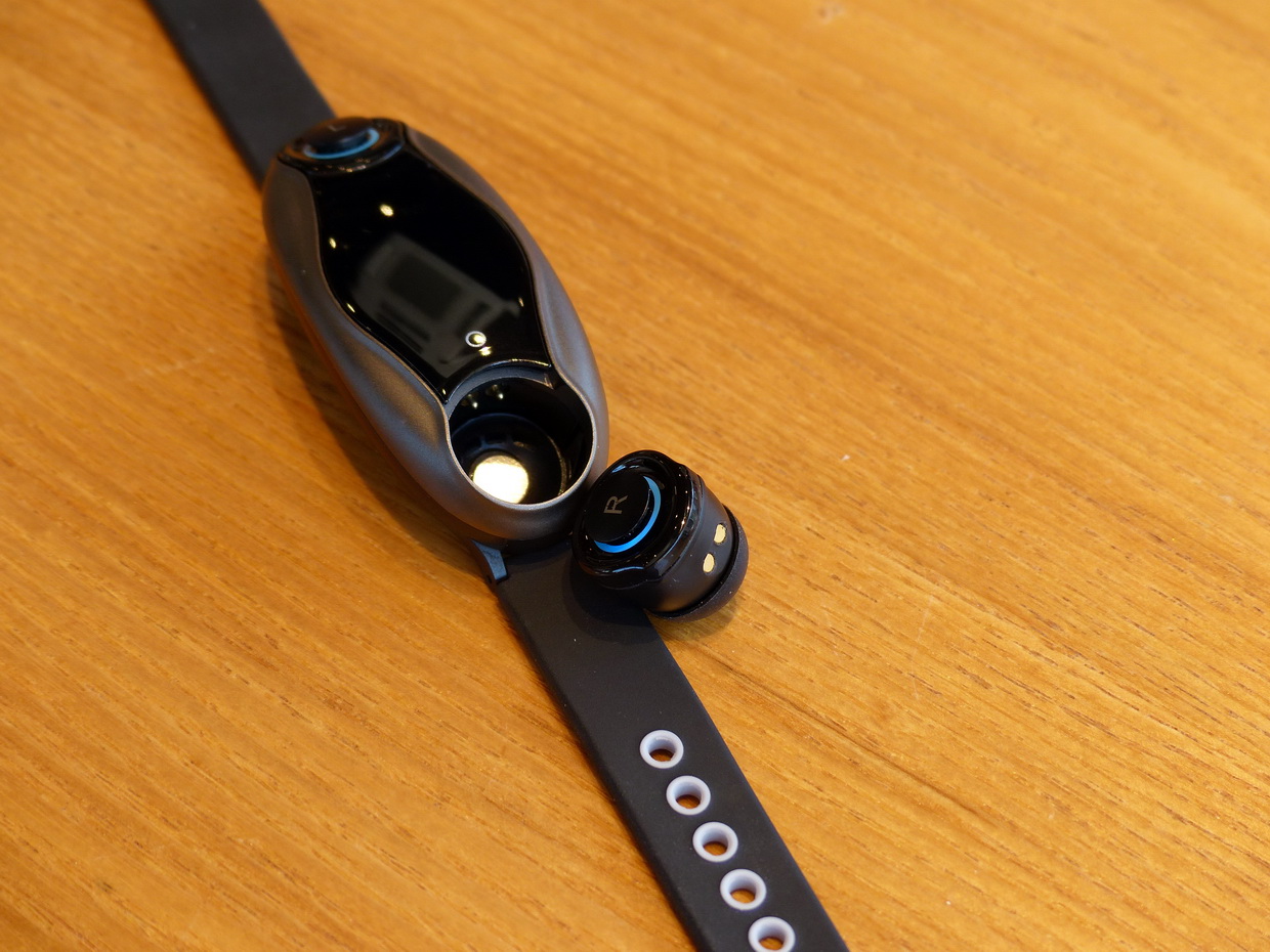 Красивые «кнопки» на концах есть ничто иное, как беспроводные наушники. Браслет стал зарядной базой для них, превращая трекер в гибрид.
