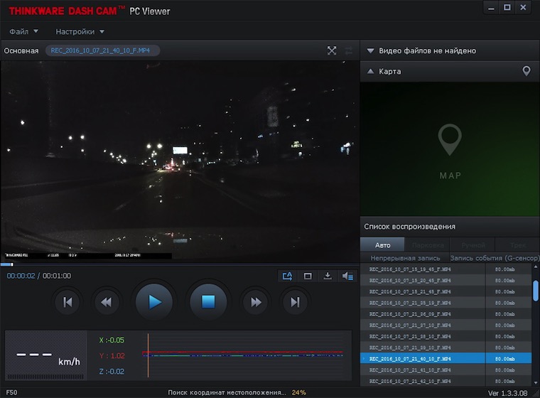Не ищите на фотографиях экран — как уже было сказано, в Thinkware F50 его нет. И Wi-Fi для управления/настройки со смартфона тоже нет. Это, как мы уже говорили в самом начале, одна из причин невысокой цены модели: настраивать Thinkware F50 можно только с компьютера, вставив карту в SD-адаптер и запустив программу Thinkware Dashcam Viewer. Она отвечает за просмотр видеороликов, отображение данных G-сенсора, демонстрацию маршрута на Google Maps (при наличии вышеописанного внешнего GPS-приемника), обновление прошивки и настройки регистратора.