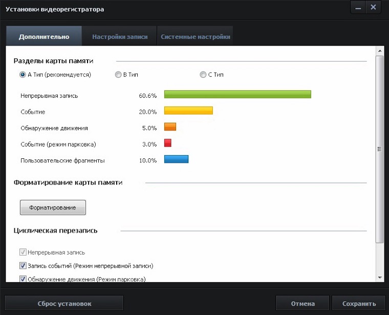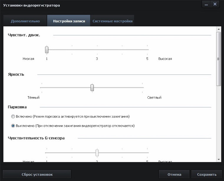 Вот несколько скриншотов — чтобы было понятно, что можно перенастроить и изменить. Если коротко, то можно включить датчик движения (старт записи после появления движения в кадре в парковочном режиме), сделать видео ярче или темнее, настроить громкость голосовых уведомлений, настроить чувствительность G-сенсора, указать распределение памяти между событиями/типами записи. Например, для обычной непрерывной записи следует выделить как можно больше места, а вот для защищенных записей по G-сенсору — меньше, так как аварийные ситуации, в которых срабатывает этот датчик, случаются достаточно редко (и слава богу!).