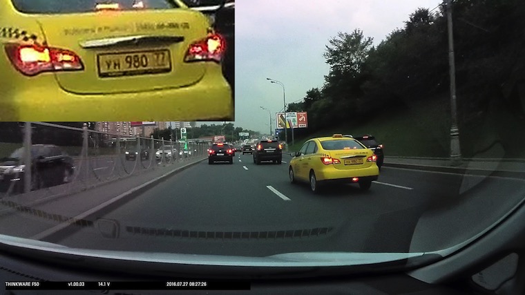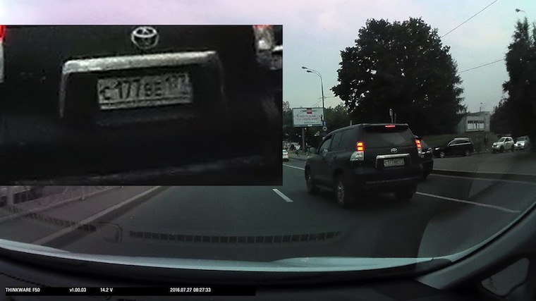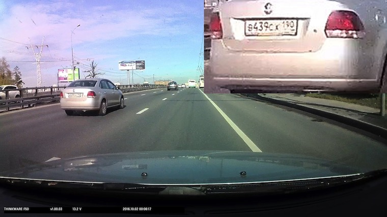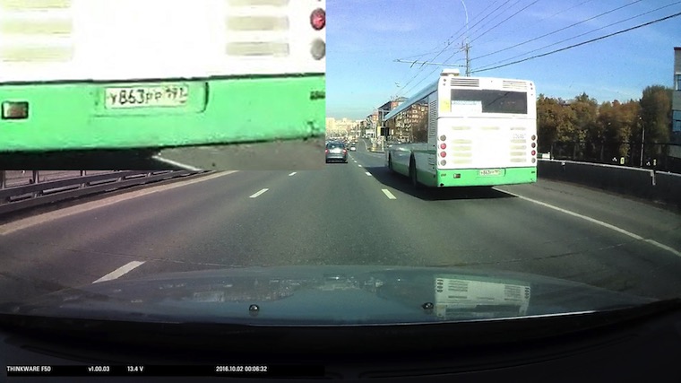 Солнечный день. Солнце светит попутно машине с регистратором, что может приводить к засвечиванию вплоть до полной неразборчивости госномеров. В случае Thinkware F50 по-прежнему можно различить и без труда прочесть буквы и цифры.