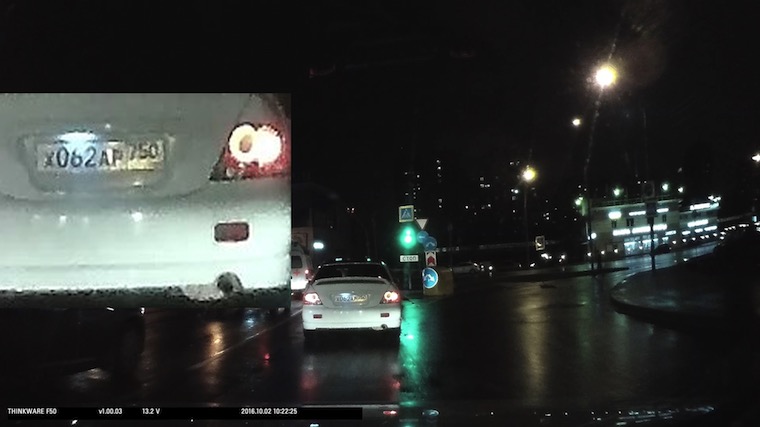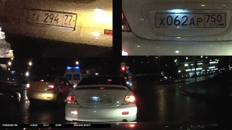 Ниже — набор стоп-кадров с видео, записанных в разное время суток. Во всех случаях с роликов удалось сделать скриншоты, на которых можно без особого труда разобрать номера автомобилей. И это — лучшее доказательство высокого качества видео в Thinkware F50.