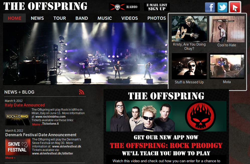 Просто удивительно, насколько уже сейчас распространено мнение, что собственный сайт можно заменить аккаунтом в ЖЖ, Твиттером или сообществом на Facebook. Всё больше в сети людей, для которых "собственный сайт" - это просто ссылка в профиле, на которую никто не нажимает. Группа The Offspring - это ребята того уровня, на котором вообще можно ограничиться страницей в Википедии, однако они позаботились о том, чтобы их сайт был полноценным представительством в сети. Они ещё застали интернет, в котором не было Facebook. Они собирали стадионы, когда Цукерберг ещё только мечтал о крутых визитках.