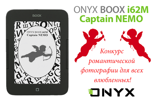 Компания МакЦентр рада сообщить о первом конкурсе в «Клубе любителей электронных книг ONYX» в социальной сети «ВКонтакте» ко Дню всех влюбленных. Для того чтобы принять участие в конкурсе, необходимо с 6 по 13 февраля включительно разместить в «Клубе любителей электронных книг ONYX» оригинальную романтическую фотографию и ждать, когда она наберет наибольшее количество «лайков». Победитель конкурса в качестве приза получит электронную книгу ONYX BOOX i62M Captain Nemo. Итоги конкурса будут подведены 14 февраля, в День всех влюбленных. Обращаем ваше внимание, что представленная на конкурс фотография должна быть оригинальной, а не взятой из Интернета. Желаем удачи всем участникам конкурса!