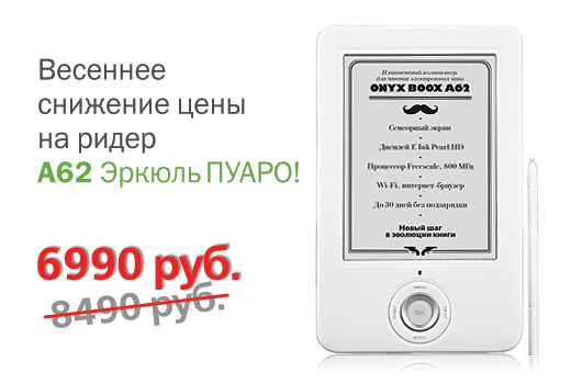 Компания МакЦентр рада сообщить о снижении цены на первую в мире 6-дюймовую электронную книгу с сенсорным экраном E Ink Pearl HD ONYX BOOX A62 Эркюль ПУАРО, входящую в «детективную серию». Теперь полнофункциональную модель, выполненную в белом цвете, можно приобрести за 6 990 рублей, что делает ее привлекательным и доступным подарком всем поклонницам чтения к 8 Марта. Отличительными особенностями модели ONYX BOOX A62 Эркюль ПУАРО являются новейший экран E Ink Pearl HD, поддерживающий сенсорную функцию, и Wi-Fi-модуль, позволяющий просматривать интернет-сайты и загружать информацию из Интернета прямо на устройство. Сенсорный экран безопасен для глаз и не влияет на качество изображения, обеспечивая оптимальную точность распознавания нажатий и позволяя делать рукописные пометки на полях при чтении. Он имеет контрастность 12:1, разрешение 768 на 1024 пикселей и способен отображать 16 градаций серого цвета, не расходуя заряд аккумулятора при статичном, сформированном изображении. ONYX BOOX A62 Эркюль ПУАРО оснащена самым мощным процессором, используемым в настоящее время в ридерах, с тактовой частотой 800 МГц, что заметно увеличивает производительность устройства как по скорости загрузки файлов и листания, так и при масштабировании документов и копировании файлов. Более подробную информацию о модели можно получить на сайте ONYX BOOX , а приобрести ее можно в интернет-магазине Palmstore.ru .