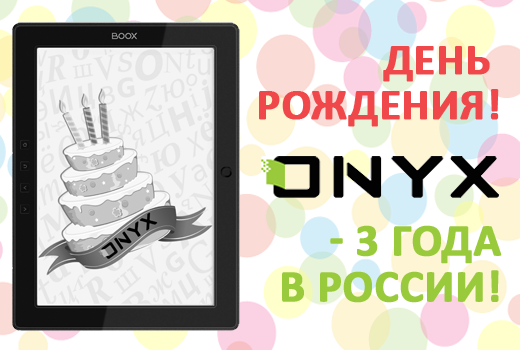 Компания МакЦентр, эксклюзивный дистрибьютор продукции ONYX International на территории России, рада сообщить всем любителям электронных книг, что исполнилось ровно три года с момента появления на российском рынке первой официально представленной электронной книги ONYX BOOX. Модель ONYX BOOX 60 была оснащена 6-дюймовым сенсорным E Ink экраном с разрешением 600 на 800 пикселей, процессором с тактовой частотой 532 МГц, 128 Мб оперативной и 512 Мб flash-памяти, а также Wi-Fi-модулем. Со временем электронные книги ONYX BOOX все больше совершенствовались и завоевывали популярность среди российских пользователей. В 2011 году были представлены первая на российском рынке электронная книга с экраном E Ink Pearl (ONYX BOOX A61S Hamlet) и первые в мире 9,7-дюймовые модели с экранами E Ink Pearl с контрастностью 12:1, входящие в «античную» серию. А в апреле 2012 года появились первые в мире электронные книги с экранами E Ink Pearl HD и функцией multi-touch (ONYX BOOX i62M Pilgrim и ONYX BOOX i62M Duncan). В этот период на российском рынке были представлены тематические серии электронных книг ONYX BOOX, посвященные творчеству Вильяма Шекспира и Жюля Верна, а также «детективная» и «античная» серии. Модели этих серий ONYX BOOX снискали большую популярность у любителей комфортного чтения и получили высокую оценку экспертов большинства авторитетных изданий, посвященных электронике и мобильным устройствам. А осенью этого года на российском рынке была представлена первая официальная электронная книга с подсветкой экрана ONYX BOOX i62ML Aurora. Модель вызвала большой интерес со стороны пользователей и получила множество положительных отзывов со стороны экспертного сообщества. Помимо подсветки эта модель стала первой в линейке ONYX BOOX электронной книгой, на которой были установлены словари ABBYY Lingvo. Также в этом году в России появились первый фирменный салон электронных книг ONYX BOOX, расположенный в ТЦ «Город-Лефортово», и интернет-магазин электронных книг ONYX BOOX www.onyxboox.ru, позволивший приобретать новинки ONYX BOOX всем жителям России. «Продукция ONYX International на российском рынке с момента своего появления получила широкое распространение и большую популярность, - говорит Евгений Суворов, руководитель направления мобильных решений компании МакЦентр. - Вряд ли сейчас найдется человек, хоть как-то связанный с электроникой или чтением электронных текстов, который бы не знал электронных книг ONYX BOOX. К тому же за это время наши клиенты смогли убедиться в надежности и неизменно высоком качестве продукции ONYX». «Продукция ONYX International на российском рынке с момента своего появления получила широкое распространение и большую популярность, - говорит Евгений Суворов, руководитель направления мобильных решений компании МакЦентр. - Вряд ли сейчас найдется человек, хоть как-то связанный с электроникой или чтением электронных текстов, который бы не знал электронных книг ONYX BOOX. К тому же за это время наши клиенты смогли убедиться в надежности и неизменно высоком качестве продукции ONYX». В связи с этим событием компания МакЦентр предлагает всем желающим принять участие в акции. С 14 по 16 декабря в фирменном салоне электронных книг (телефон: +7 (495) 507-54-21), а также в интернет-магазинах ONYX BOOX и Palmstore можно будет приобрести или заказать любую модель ONYX BOOX со скидкой 1 000 рублей. При этом в заказе нужно указать фразу «С Днем рождения!». Дополнительную информацию об электронных книгах ONYX BOOX, а