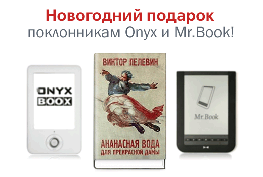 Компания МакЦентр делает Новогодний подарок всем поклонникам электронных книг Onyx Boox и Mr.Book. Каждый, кто купил устройства, выпущенные под этими брендами, получает от нас возможность бесплатно скачать новый роман Виктора Пелевина “Ананасная вода для прекрасной дамы”. Этот роман только что увидел свет и продается в Интернет-магазинах по 159 рублей за электронную копию. Наша акция согласована с правообладателем и расcчитана на ограниченное количество лицензий. Мы хотим, чтобы наши клиенты читали качественную литературу, причем получая ее легальным путем. Для того, чтобы бесплатно скачать книгу, необходимо зарегистрироваться на специальной страничке, посвященной акции: - ссылка для владельцев электронных книг Onyx Boox; - ссылка для владельцев электронных книг Mr.Book. После этого Вам на e-mail будет выслано письмо, содержащее код и ссылку для скачивания книги. Данная акция осуществляется при поддержке нашего партнера - популярного сервиса легального медиаконтента Аймобилко. Новый роман Пелевина «Ананасная вода для прекрасной дамы», как и все предыдущие, рассказывает о настоящем и будущем России. Действующие лица книги — прозрачно зашифрованные персонажи современной действительности, политтехнологи и агенты ФСБ. В нем есть мечта о советском Золотом веке, превратившаяся в традиционное для пелевинского творчества ничто, мусорный ветер. В акции принимают участие только устройства, официально поставленные на территорию России!