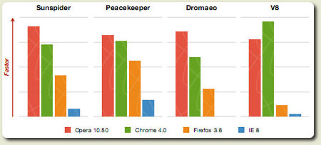 Аса Доцлер (Asa Dotzler), координатор сообщества разработчиков Firefox, поздравил в своем блоге компанию Opera с прорывом в области повышения производительности JavaScript-движков. Представленный в последней тестовой версии web-браузера Opera 10.5 новый JavaScript движок уверенно лидирует в 3 из 4 популярных пакетов для оценки производительности JavaScript - SunSpider, Peacekeeper и Dromaeo, немного уступая лишь Google Chrome в специально созданном для него тесте V8.