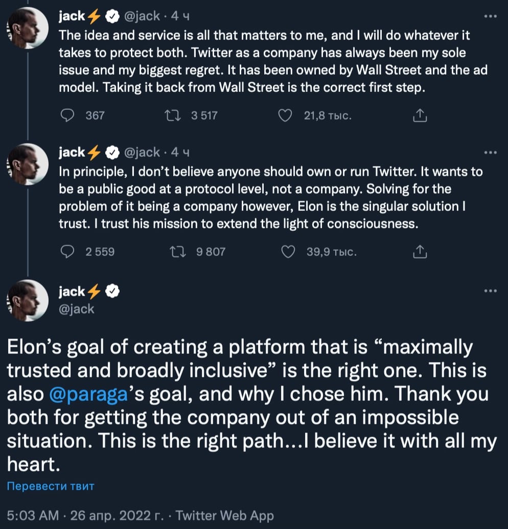 В принципе, я не считаю, что кто-то должен владеть Twitter или управлять им. Он должен быть общественным благом на уровне протокола, а не компанией. Однако, решая проблему того, что это компания, Илон — единственное решение, которому я доверяю. Я доверяю его миссии по распространению света сознания.