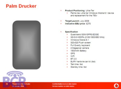 В сеть попала информация о планах по выпуску телефонов в 2008 году оператором Vodafone. В том числе, было обнаружено несколько новых мобильных устройств на базе Windows Mobile. Один из них - коммуникатор Palm под кодовым названием Drucker. Предположительно, это будет моральный наследник коммуникатора Treo 750, выпущенного в 2006 году. Среди характеристик Palm Drucker упоминаются такие несвойственные коммуникаторам Palm возможности, как поддержка беспроводных сетей Wi-Fi и GPS-навигации. Предположительные характеристики Palm Drucker: - Операционная система Windows Mobile 6.1 Professional - Сотовые сети GSM/GPRS/EDGE (850/900/1800/1900 МГц) и UMTS/HSDPA (850/1900/2100 МГц) - Дисплей с разрешением 320x320 (!) пикселей - 2-Мп камера - GPS-модуль - QWERTY-клавиатура - Wi-Fi и Bluetooth 2.0 - Аккумулятор ёмкостью 1500 мАч Ожидается, что коммуникатор будет представлен в июле 2008 года. Ориентировочная цена - 280 фунтов стерлингов. Напомним, что Treo 750 также был изначально выпущен оператором Vodafone, а затем появился в свободной продаже.