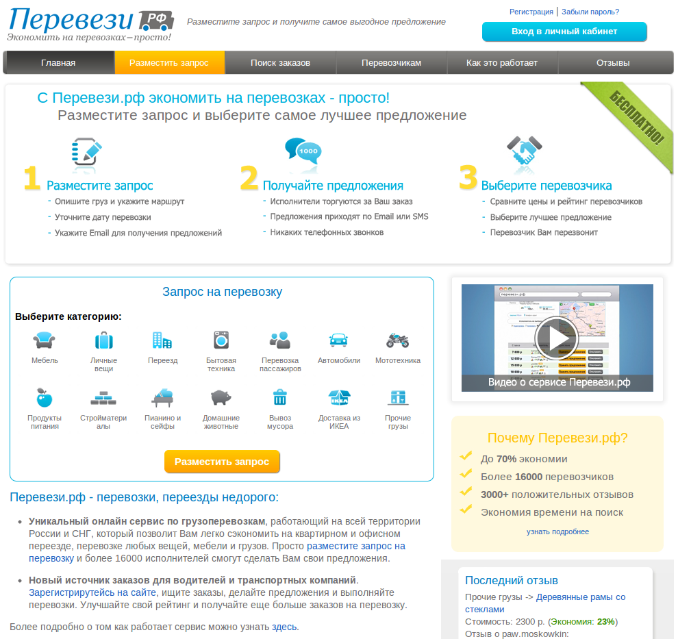 Самый плюс, что на Перевези.рф нет объявлений перевозчиков. Нет всего этого потока однообразной и бессмысленной информации, в котором клиент почему-то должен копаться в поисках подходящего исполнителя. Клиент говорит, что ему нужно, а перевозчики сами его ищут и конкурируют за его внимание. Он видит уровень цен на рынке и может принимать решение не боясь сильно ошибиться. При этом почти аукционный принцип битвы за клиента должен (по идее) обеспечивать существенную экономию.