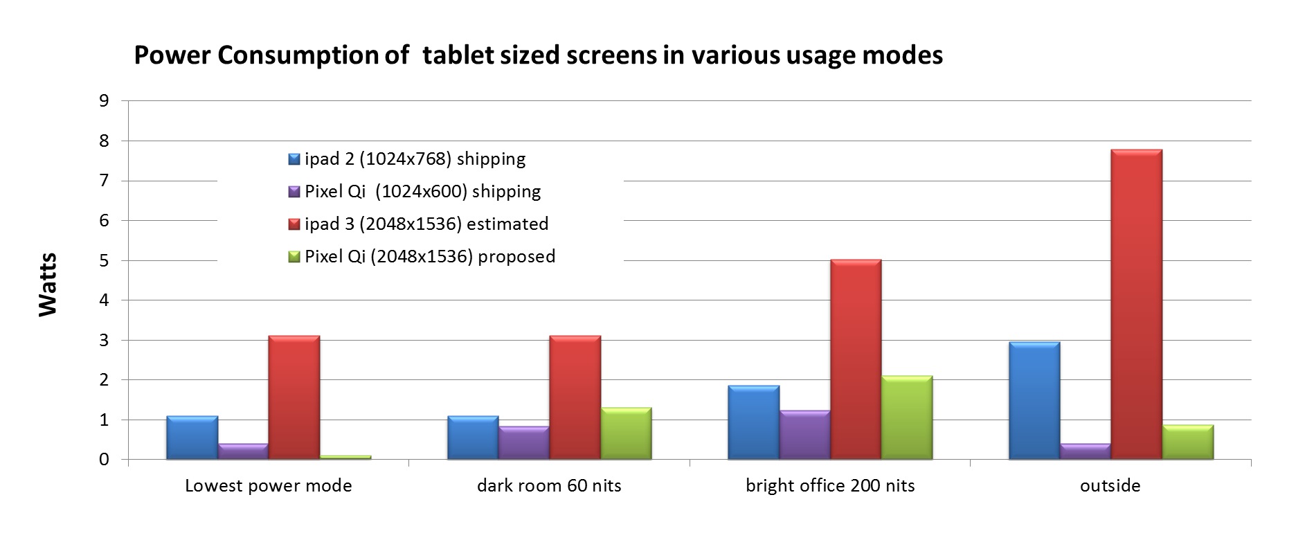 Как сообщает основатель компании Pixel Qi Мари Лоу Йепсен (Mary Lou Jepsen) в своем корпоративном блоге, их новые технологии позволяют создать дисплей, который будет конкурировать с экраном в iPad третьего поколения в плане четкости, контрастности и насыщенности цветов, но при этом потреблять в разы меньше энергии. Более того, разработчики даже добавили в свое решение режим, при котором энергопотребление в 100 раз ниже по сравнению с максимальным показателем экрана в новом iPad. Остается дождаться появления на рынке планшетов с подобными дисплеями, а пока нашему вниманию предлагаются графики, иллюстрирующие преимущества разработок Pixel Qi.