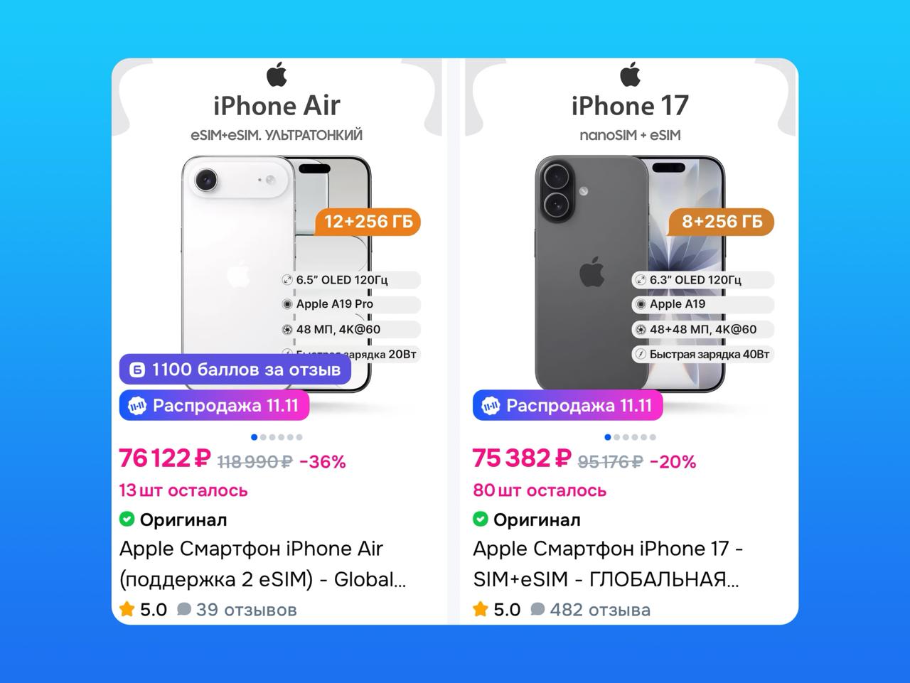 Вторая — iPhone Air в России уже сравнялся в цене с базовым iPhone 17 и стоит в районе 75–76 тысяч рублей. Но даже эта сумма ощущается завышенной, а еще дешевле новинку уже вряд ли будут продавать: сейчас прайс и так ниже стартового.