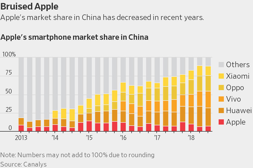 WSJ приводит и наглядную диаграмму, демонстрирующую резкое падение интереса покупателей к Apple в Китае.